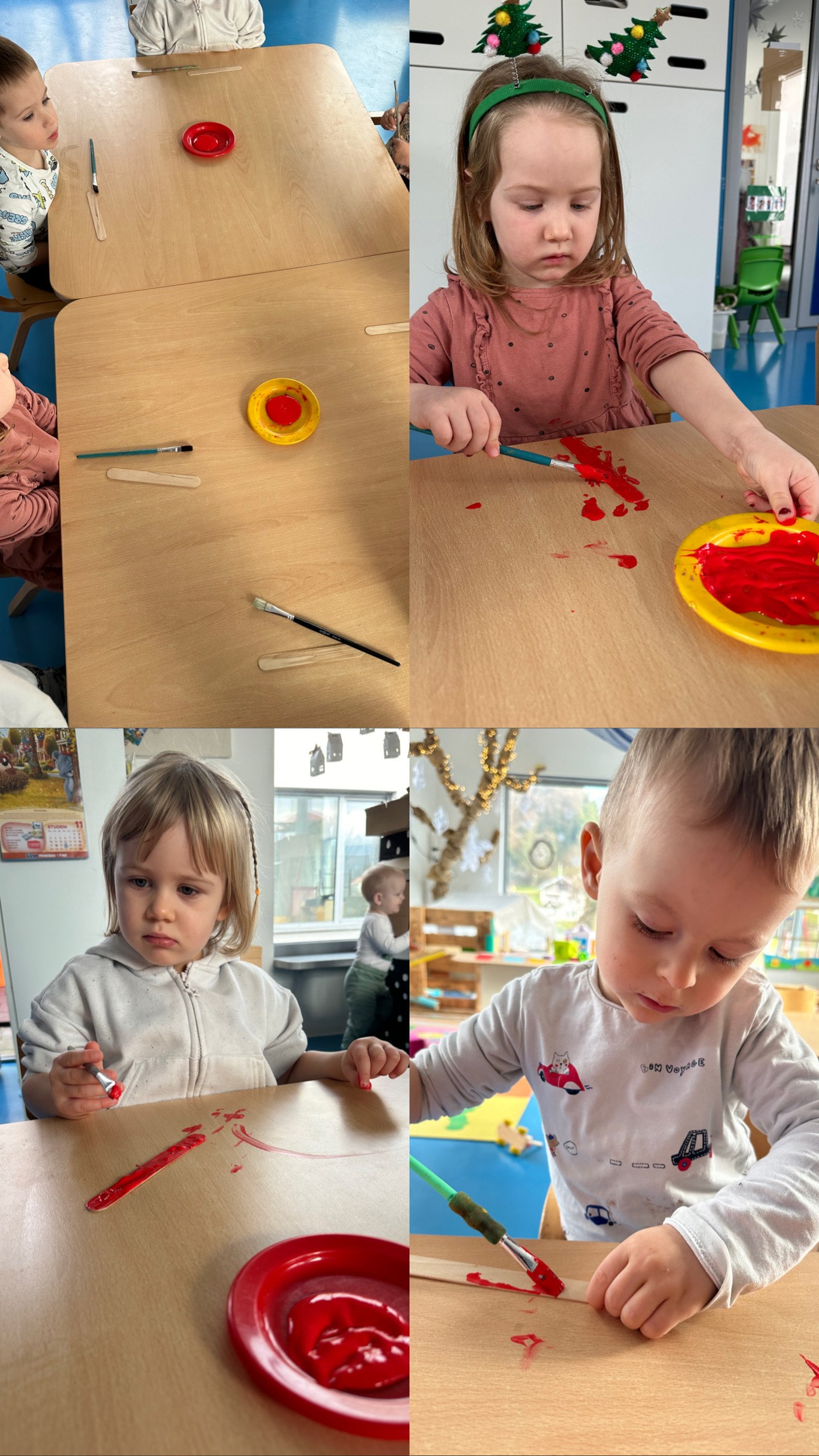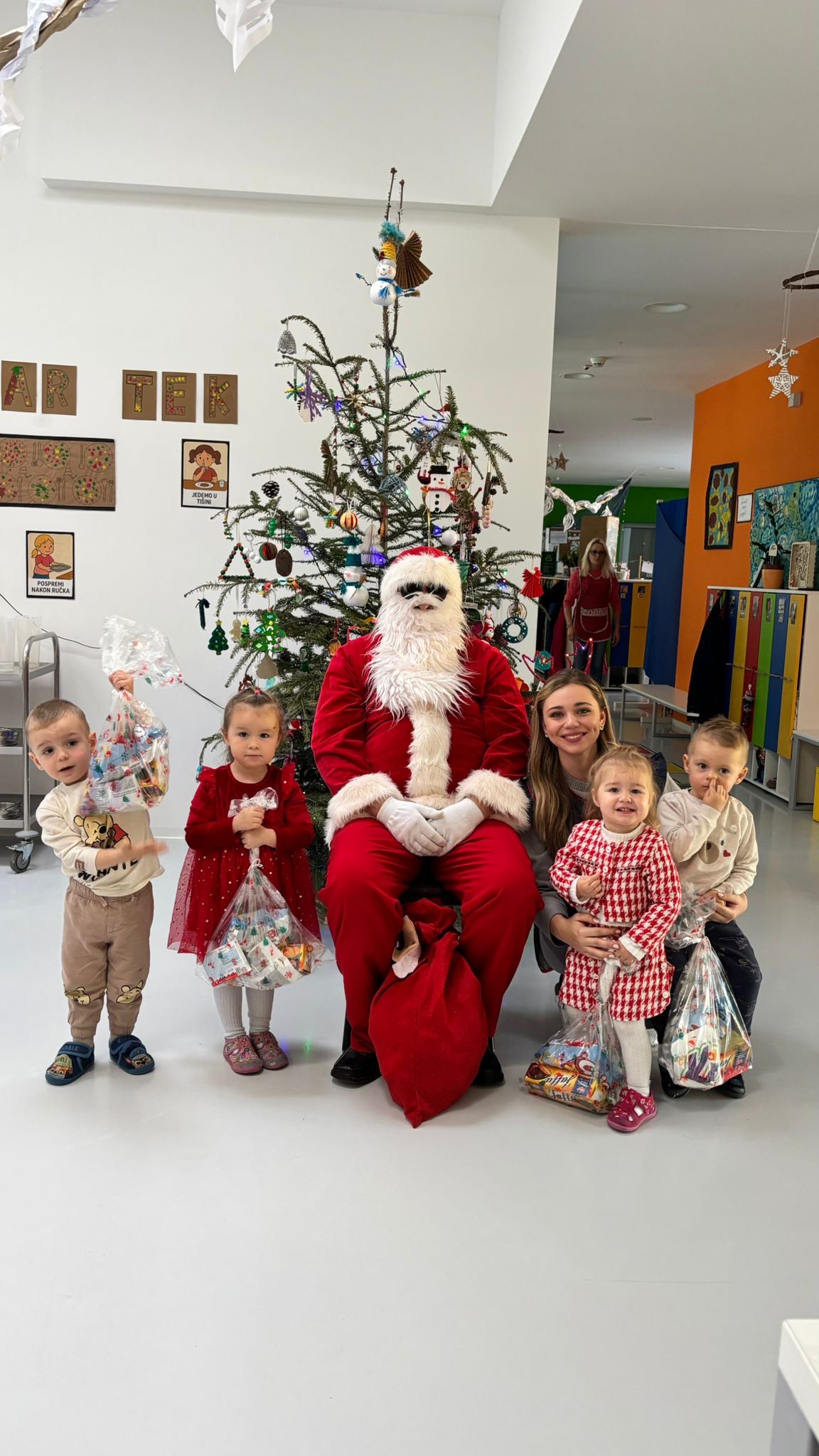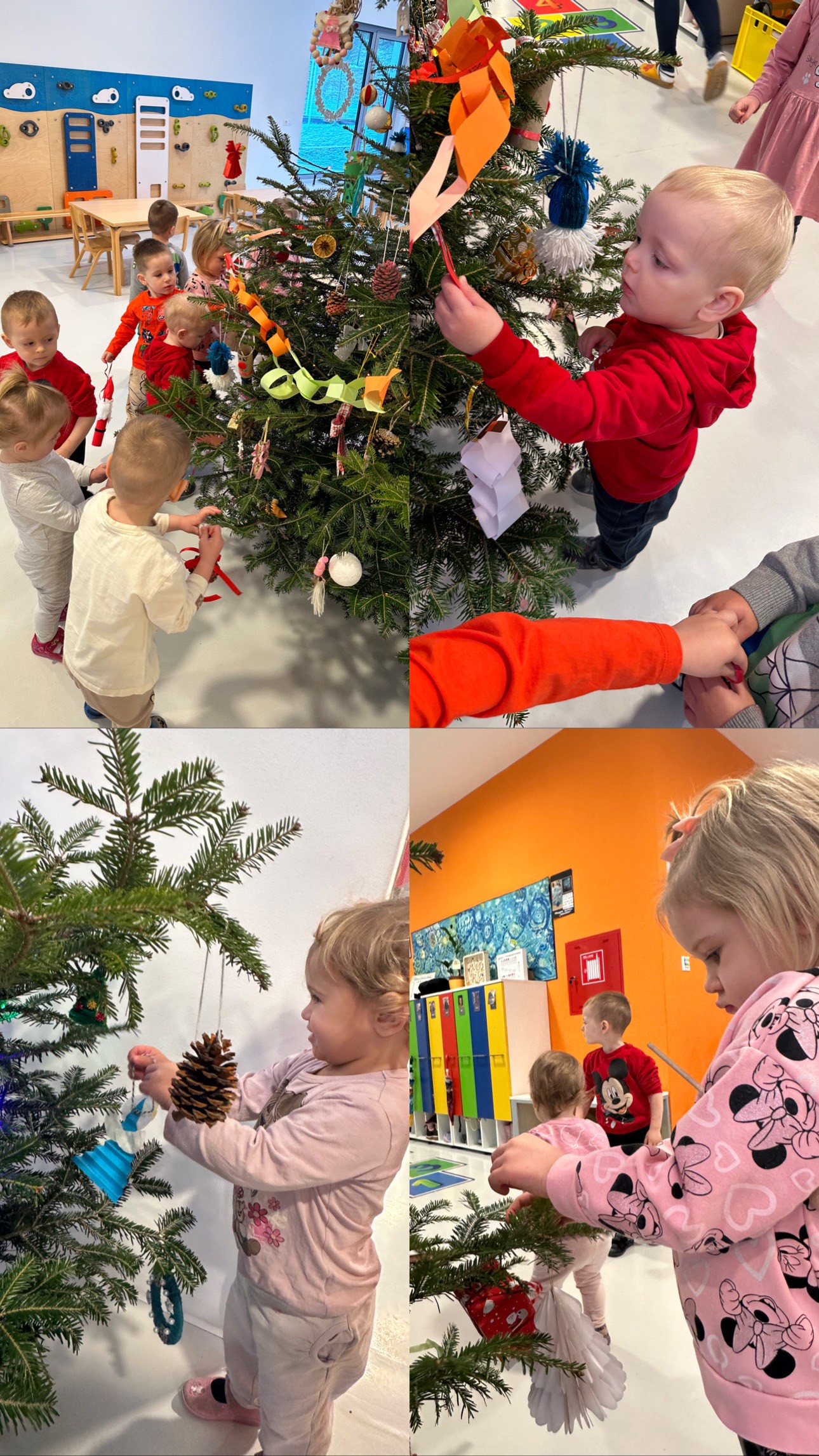U božićnom razdoblju u odgojnoj skupini „Žabice“ provodili smo niz raznovrsnih, sadržajno bogatih i djeci zanimljivih aktivnosti kojima smo poticali razvoj kreativnosti, suradnje, osjetilnog iskustva te njegovanje blagdanskog duha i zajedništva. Božićno ozračje započeli smo izradom božićnog poklona za roditelje. Djeca su bojala drvene štapiće crvenom temperom te otiskivala svoje dlanove na papir u zelenoj boji, čime su kroz likovno izražavanje razvijala finu motoriku, kreativnost i osjećaj ponosa zbog vlastitog rada. Uslijedilo je kićenje božićnog bora u predvorju vrtića.