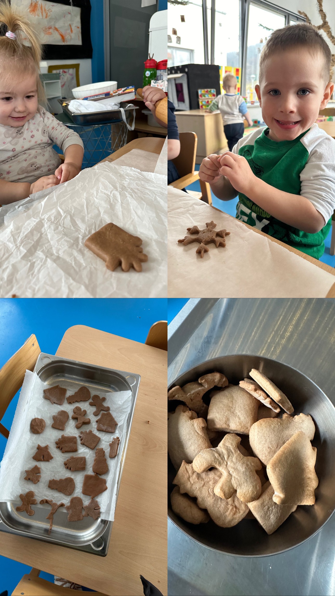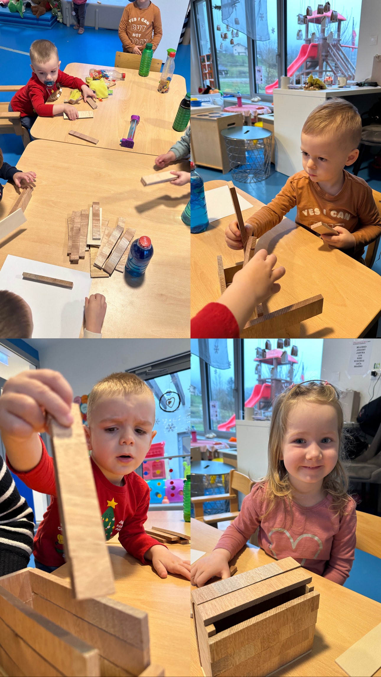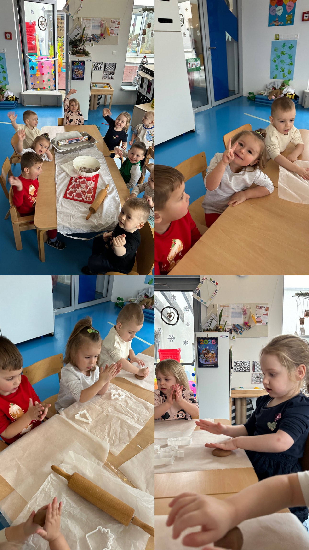 Djeca su svakodnevno brinula o pšenici zalijevanjem i promatranjem rasta, čime su razvijala osjećaj odgovornosti, strpljenje te stjecala osnovna znanja o prirodnim procesima. U sklopu humanitarne aktivnosti izradili smo drvenu kutiju za donacije božićnih fotografija. Kutiju smo izrađivali od malih drvenih daščica uz pomoć vrućeg ljepila, a aktivnost je poticala suradničko učenje, razvoj motoričkih vještina te senzibilizaciju djece za pomaganje drugima. Božićno razdoblje obogatili smo i kulinarskom aktivnošću izrade božićnih keksa. U kuhinji je kuharica zamijesila tijesto, a djeca su ga valjala, oblikovala i uz pomoć modlica izrađivala kekse. Nakon ručka djeca su s veseljem kušala pripremljene kekse, razvijajući pritom pozitivne stavove prema hrani i zajedničkom radu. Djeca su uživala i u senzoričkoj igri s vodom.