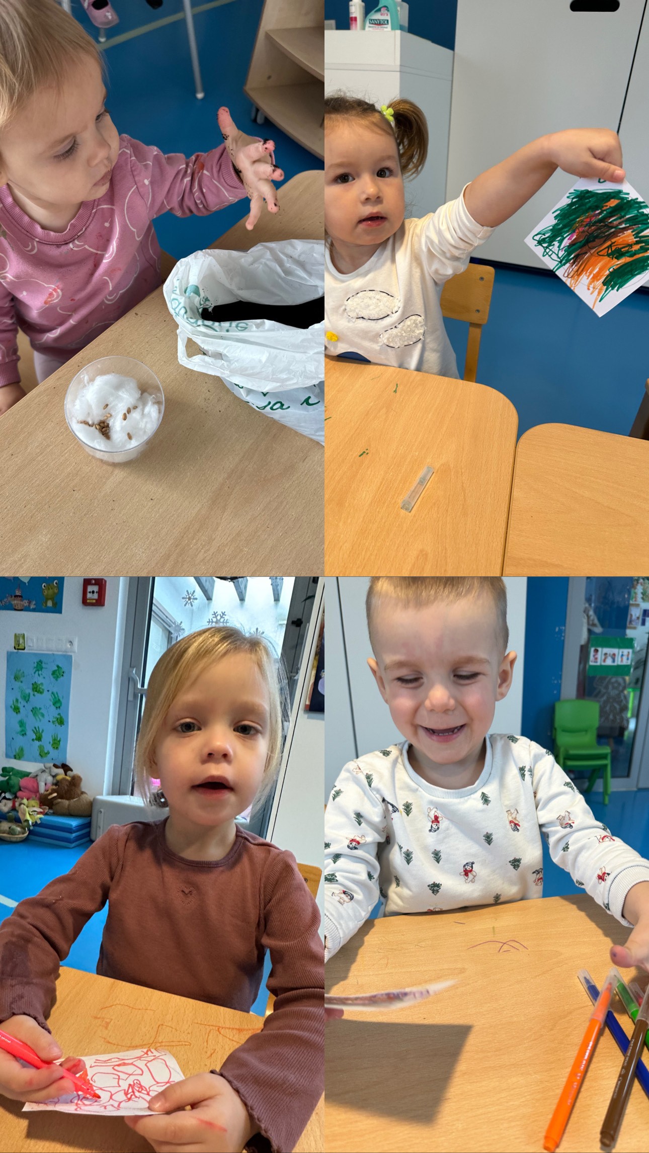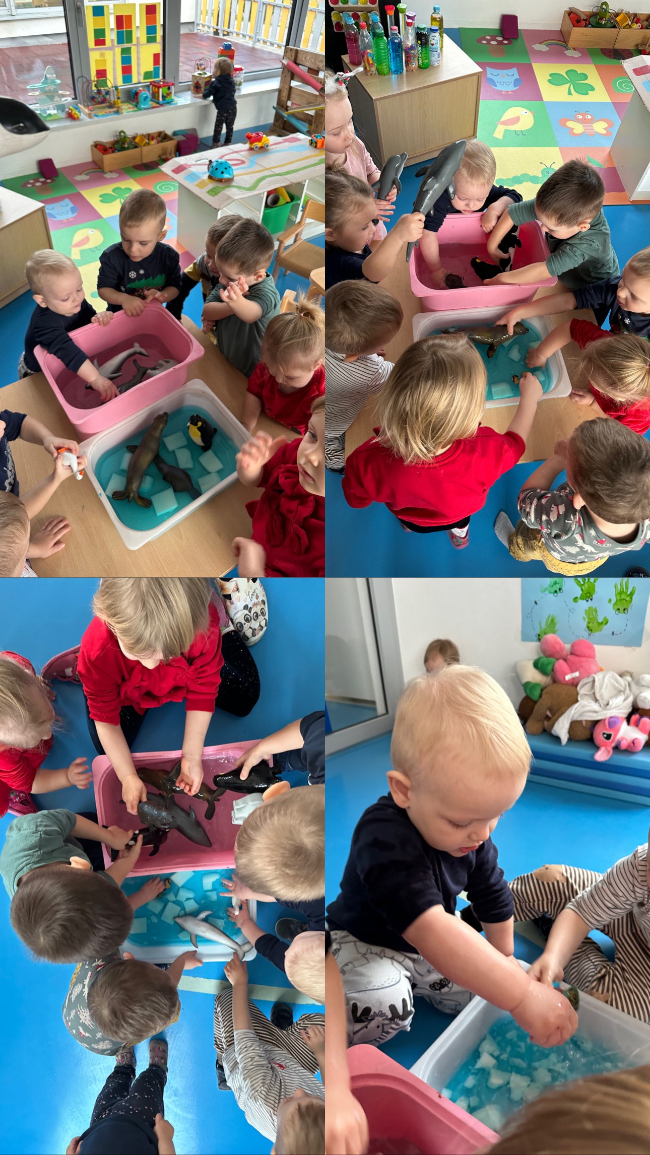 U posudama s vodom, prehrambenim bojama i želatinom, uz figurice životinja, istraživali smo „Sjeverni pol“. Ova aktivnost poticala je znatiželju, osjetilno iskustvo i slobodnu igru, prilagođenu najmlađoj dobi. Božićno razdoblje zaokružili smo svečanim božićnim ručkom u predprostoru vrtića te podjelom poklona Djeda Mraza. U toplom i mirnom okruženju djeca su doživjela radost zajedništva i blagdanske čarolije, što je zaokružilo prosinačke aktivnosti u skupini „Žabice.”