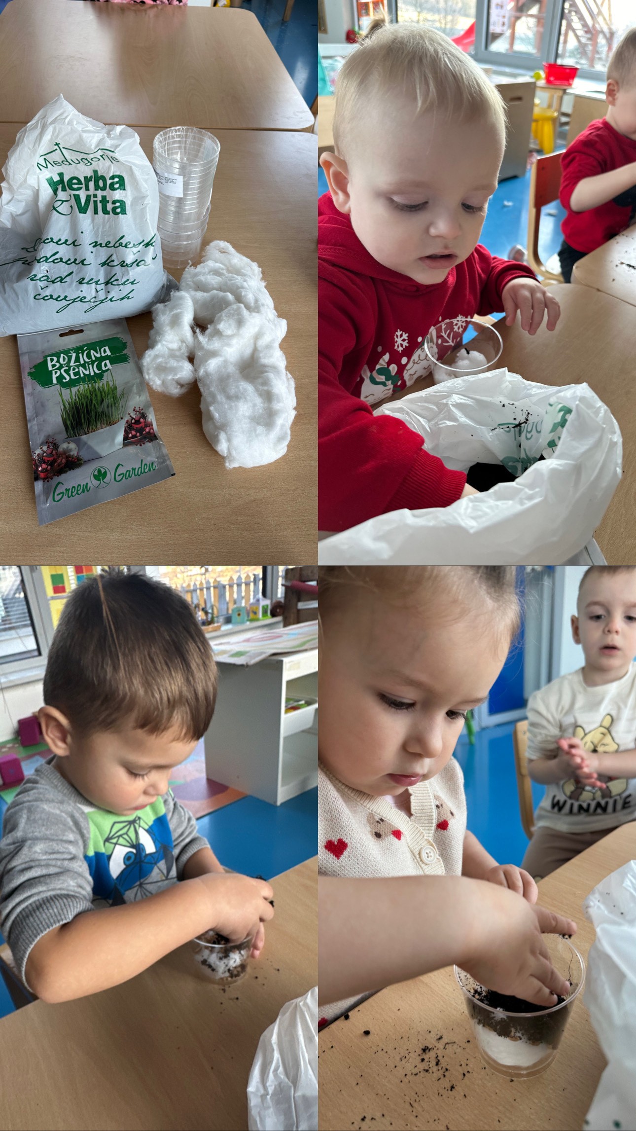 Bor smo ukrasili ukrasima koje su djeca zajedno sa svojim roditeljima izradila kod kuće, čime smo dodatno osnažili suradnju obitelji i vrtića te poticali osjećaj pripadnosti i zajedništva. Posebnu pažnju posvetili smo sadnji pšenice u male posude s vatom i zemljom.