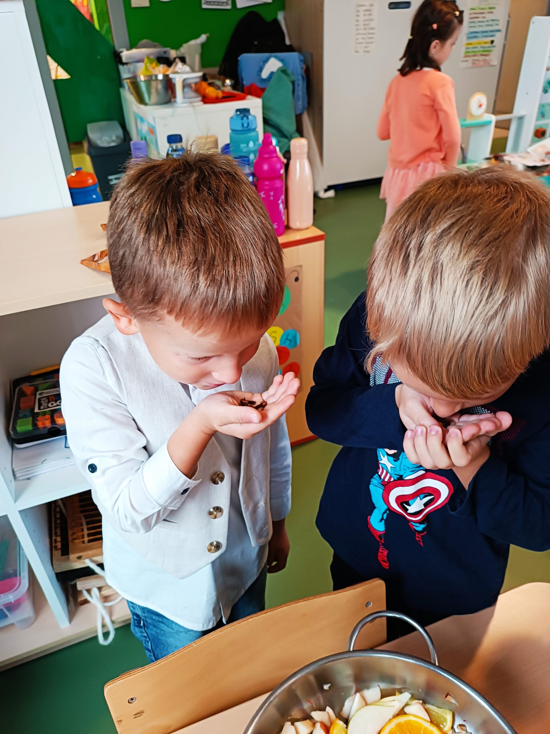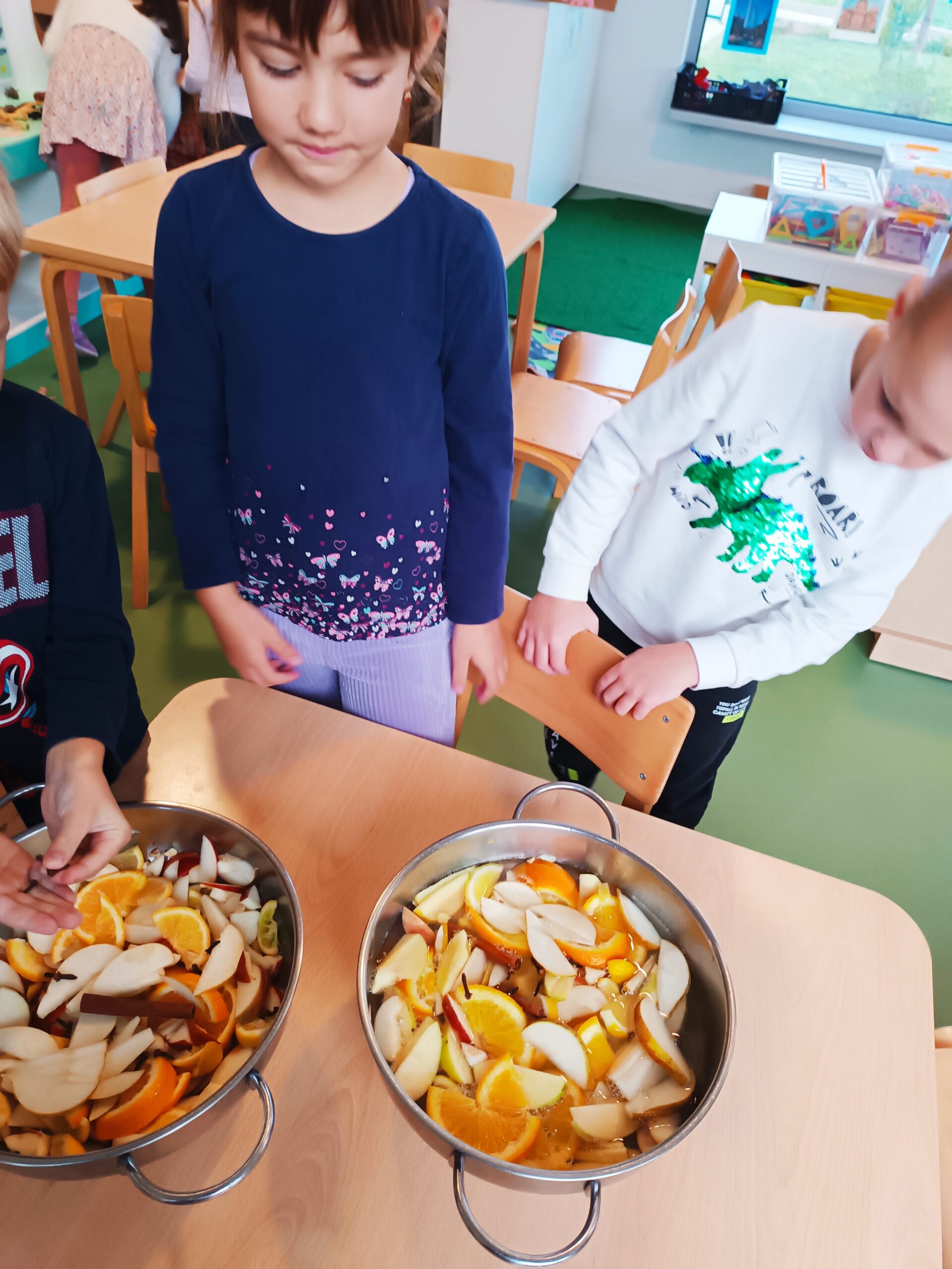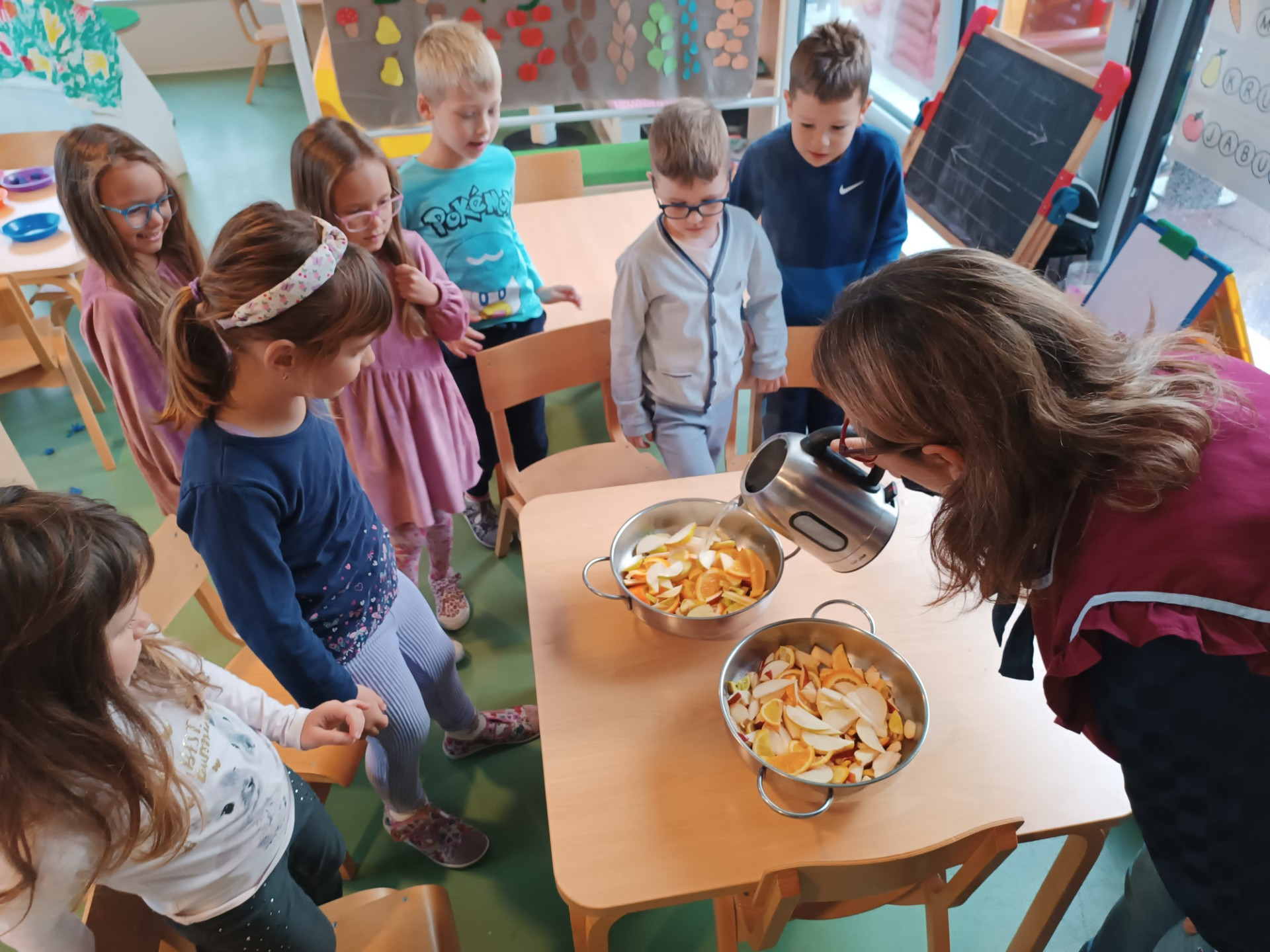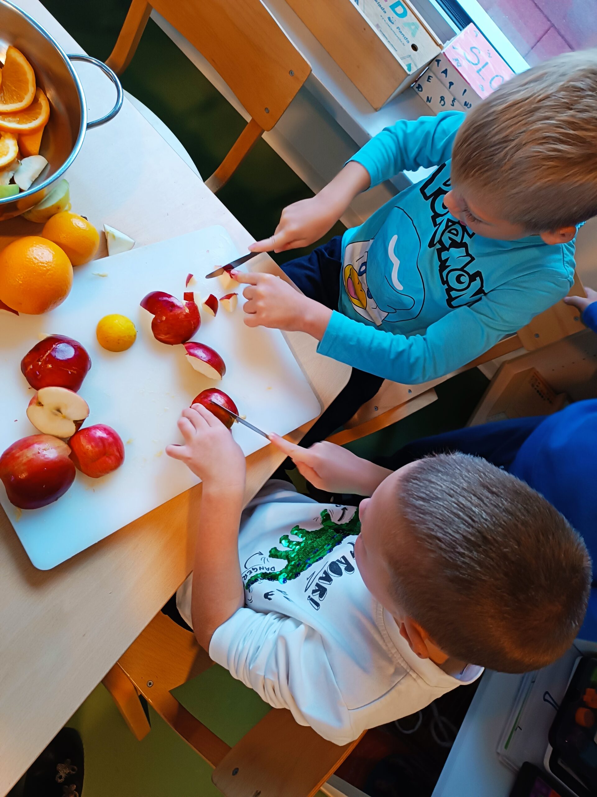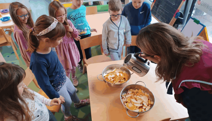 Osim što su se djeca veoma trudila da što preciznije izrežu voće i time razvijala preciznost i fini motoriku, usvajala su i nove spoznaje, bogatila svoj riječnik, istraživala putem svih osjetila, upoznala su nove namirnice kao što su začini: klinčić i cimet, razvijala predčitalačke ( pisanje recepta…) i predmatematičke (pojam količine: više-manje, cijelo-pola, oblik: okruglo, dugoljasto…) vještine.